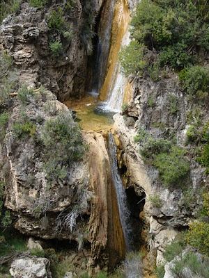 This is the "Waterfall of the petrified trees." It is so named because it stuck between the rocks there are some pine trees that were there when the loggers, long ago, were transported by the river, with over many years, the limestone deposits that pulls the water has been covering and are now really "rock."